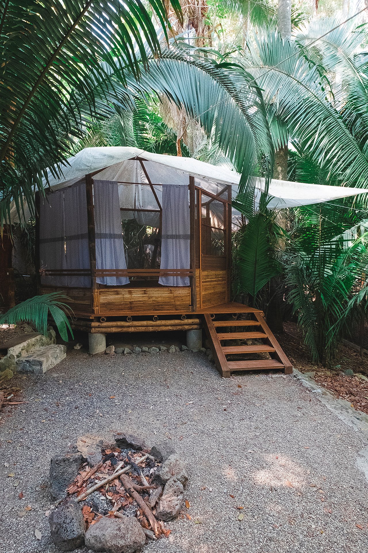 Contamos con tres cabañas independientes diseñadas para que una pareja tenga todo lo que necesita en un mismo espacio, la cual al tener un sofá del cual salen dos camas indiviudales, da la posibilidad de albergar una familia de hasta 4 personas. Su cocineta completa, su baño seco y su closet están cuidadosamente diseñados para pasar desapercibidos en el espacio central, cuyo domo deja entrar la luz cenital iluminando la cabaña y creando un ambiente sumamente especial. Cuenta con una terraza con su mesa, sillas y dos sillas acapulco para relajarte y disfrutar de la selva. La regadera se encuentra al aire libre lo que hace de bañarse una experiencia única.